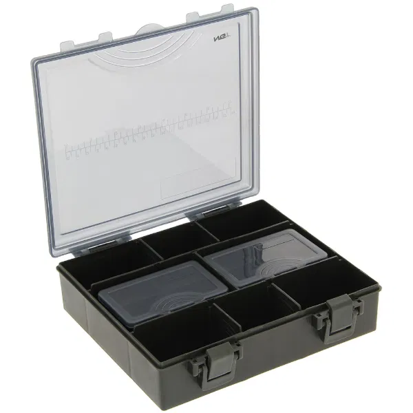 A compact, versatile tackle box system ideal for coarse or carp anglers. Supplied with a main tackle box and moveable dividers so you can customise the layout, plus four internal bit boxes for organised storage of terminal tackle and small accessories.