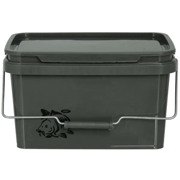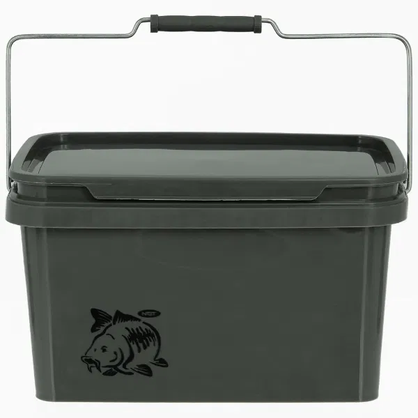 A practical 5‑litre square bucket in green camo, ideal for storing and transporting all types of fishing bait. It features an airtight lid with four secure locking sides to create a reliable seal and help keep contents fresh. Finished with a sturdy metal handle and a comfortable polymer grip for easy carrying.